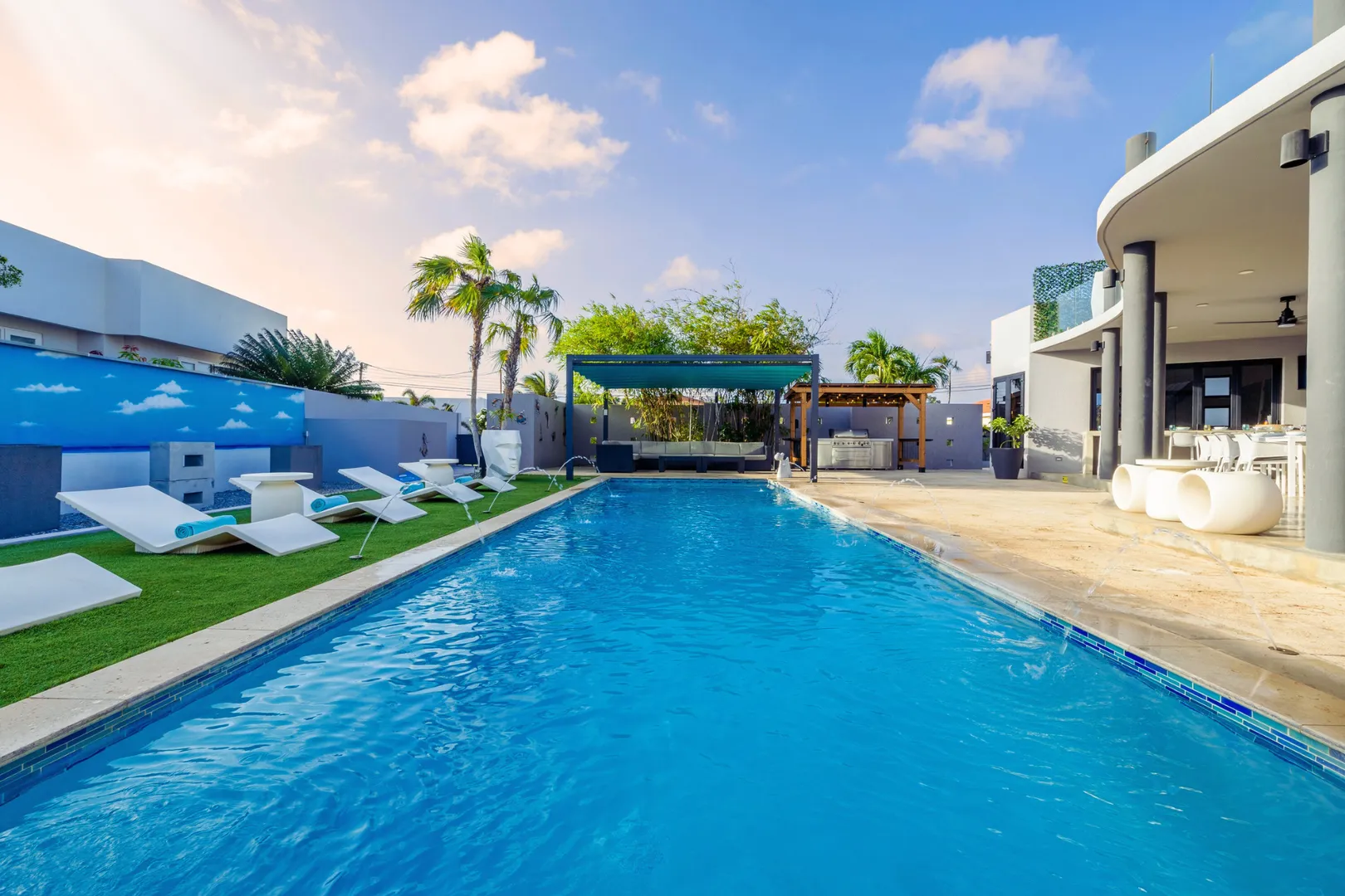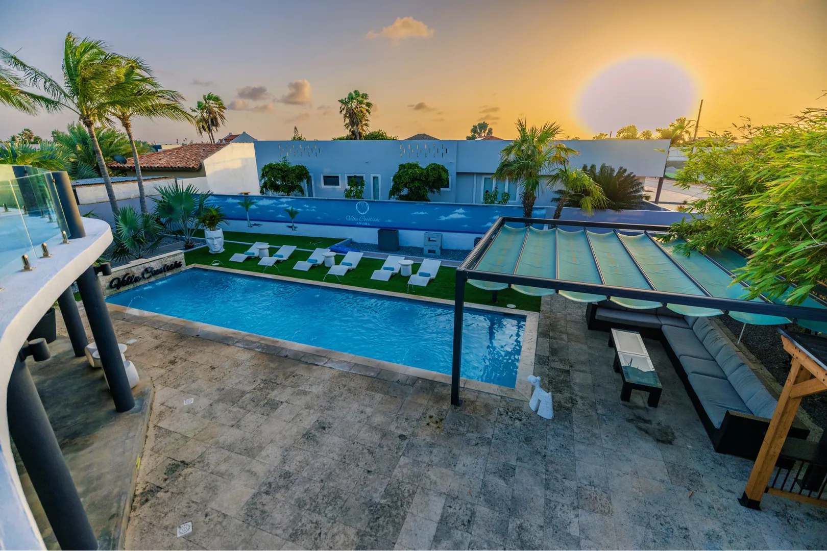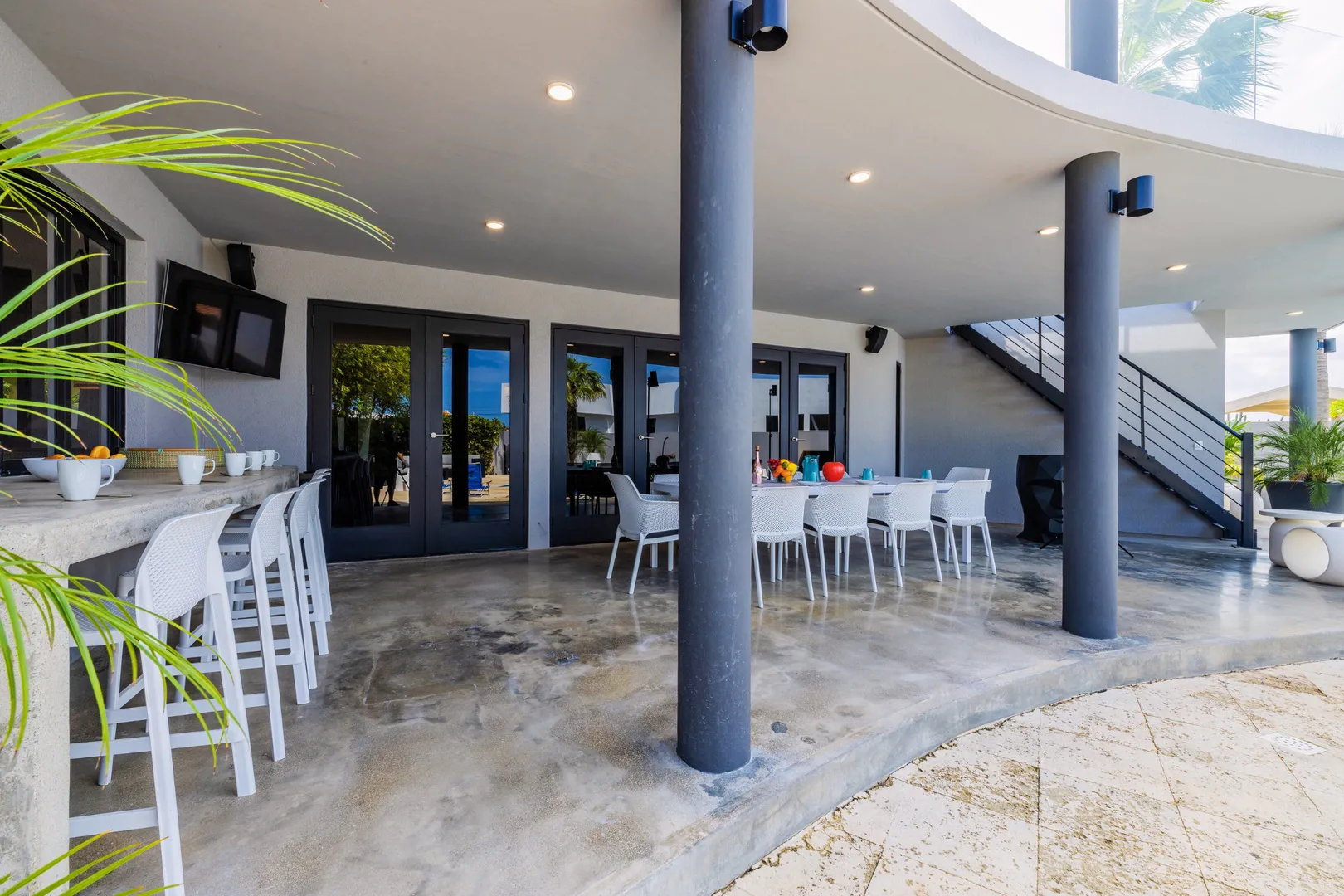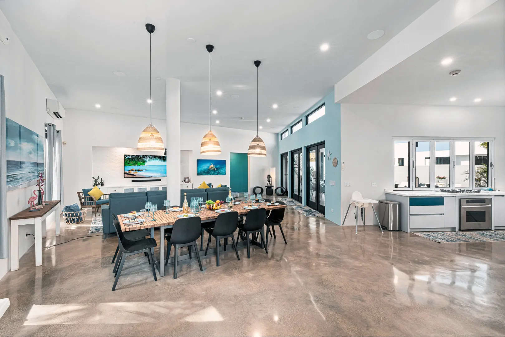 Experience the epitome of modern luxury with our open-concept villa, featuring a fully equipped kitchen with quartz countertops, a spacious dining area for ten, and entertainment amenities like a 75-inch Smart TV. Enjoy high-speed Wi-Fi, air conditioning, and a washer and dryer for your convenience. Our villa is designed to provide a seamless blend of comfort and style, ensuring a memorable stay in Aruba.